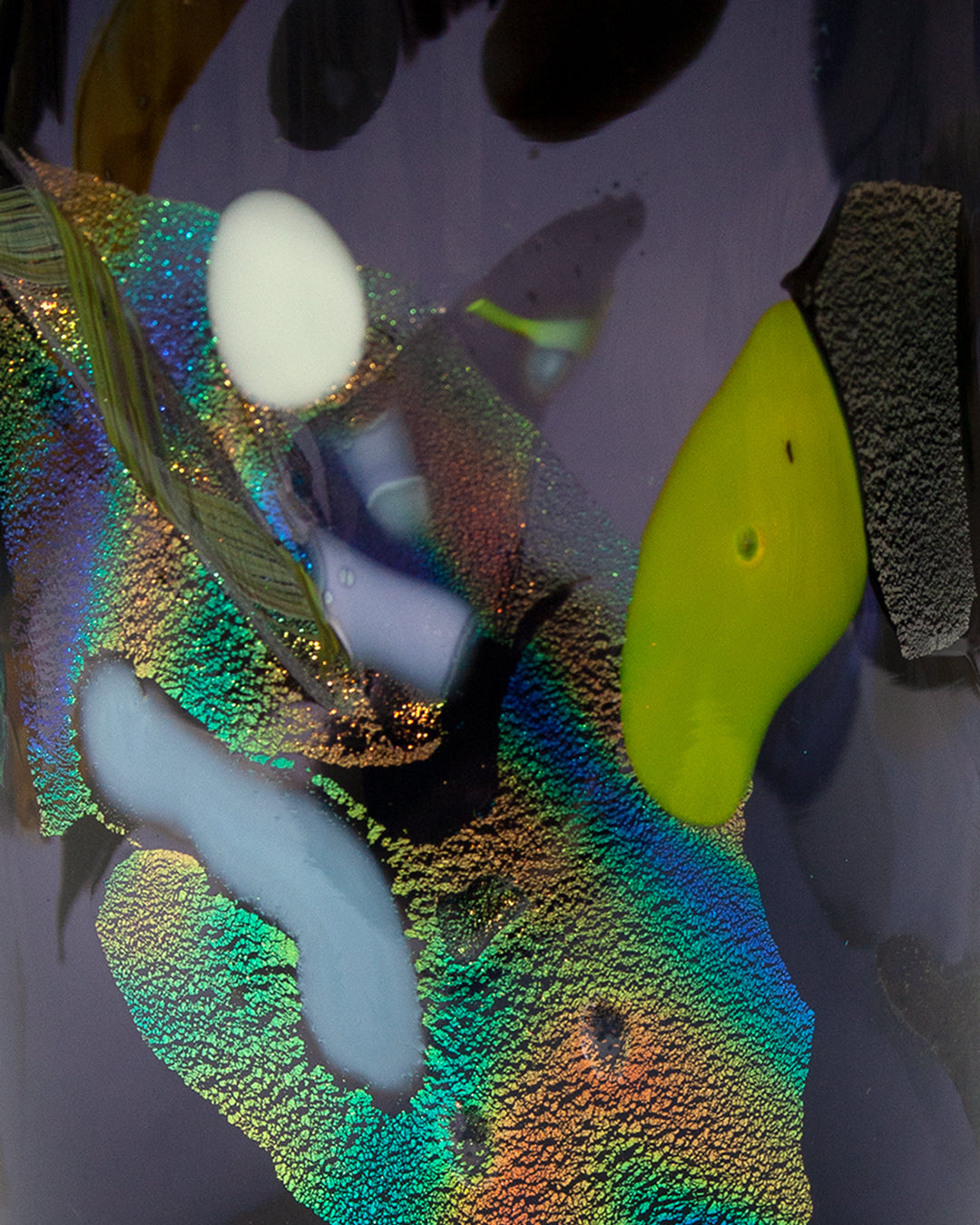 A juicy and sparkly large Black Nassau Vase that is maybe more technically violet. A generous amount of dichroic glass and multicolour decor.