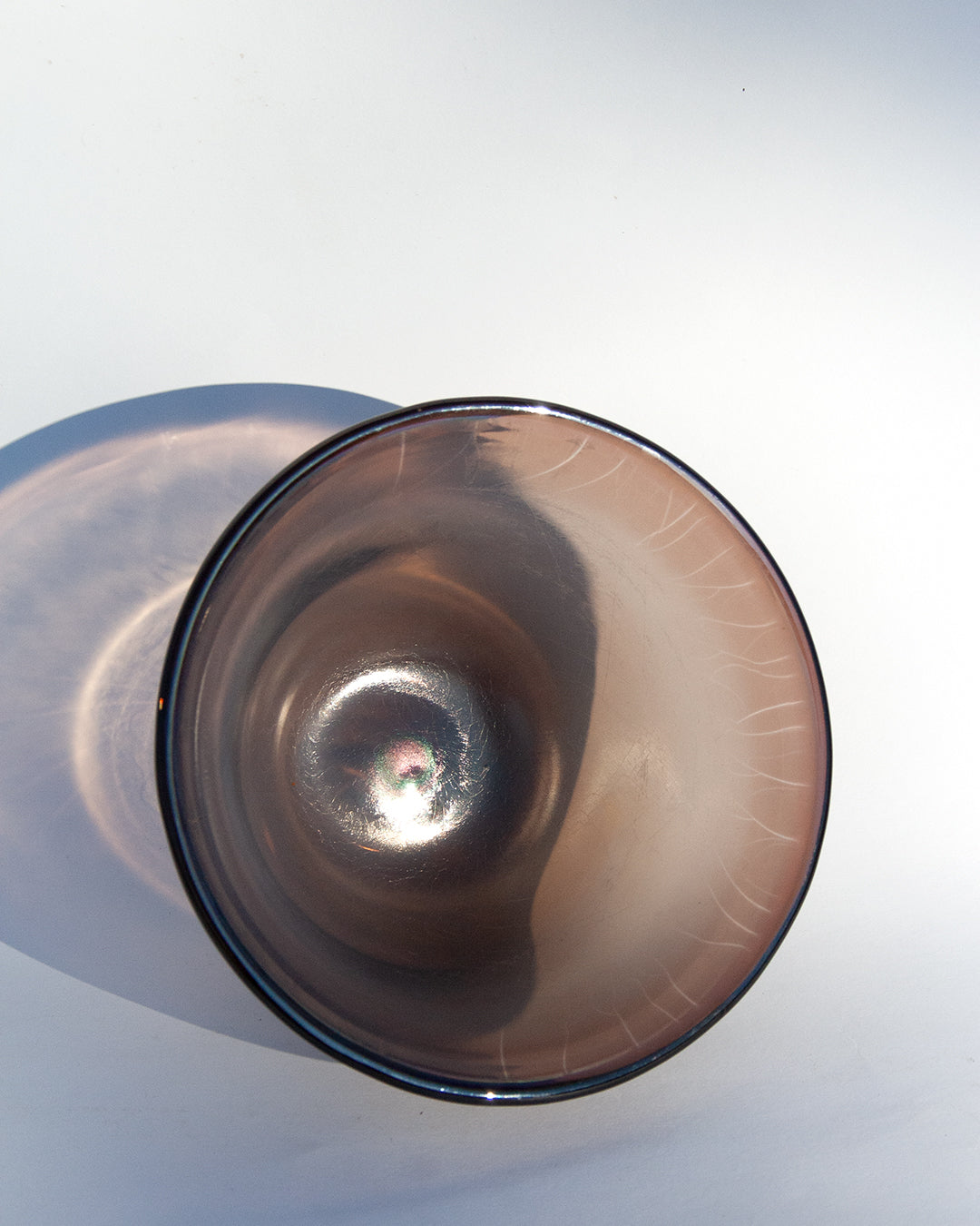 From the archives of a long time Sirius Collector. A mushroomy purple bowl with iridization and a crackling pattern on its inside. A very nice specimen.
