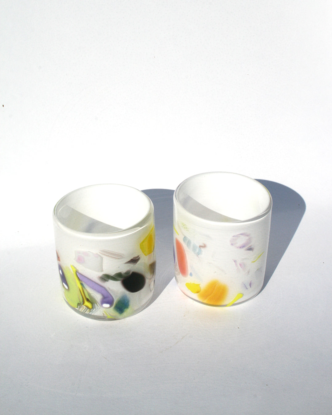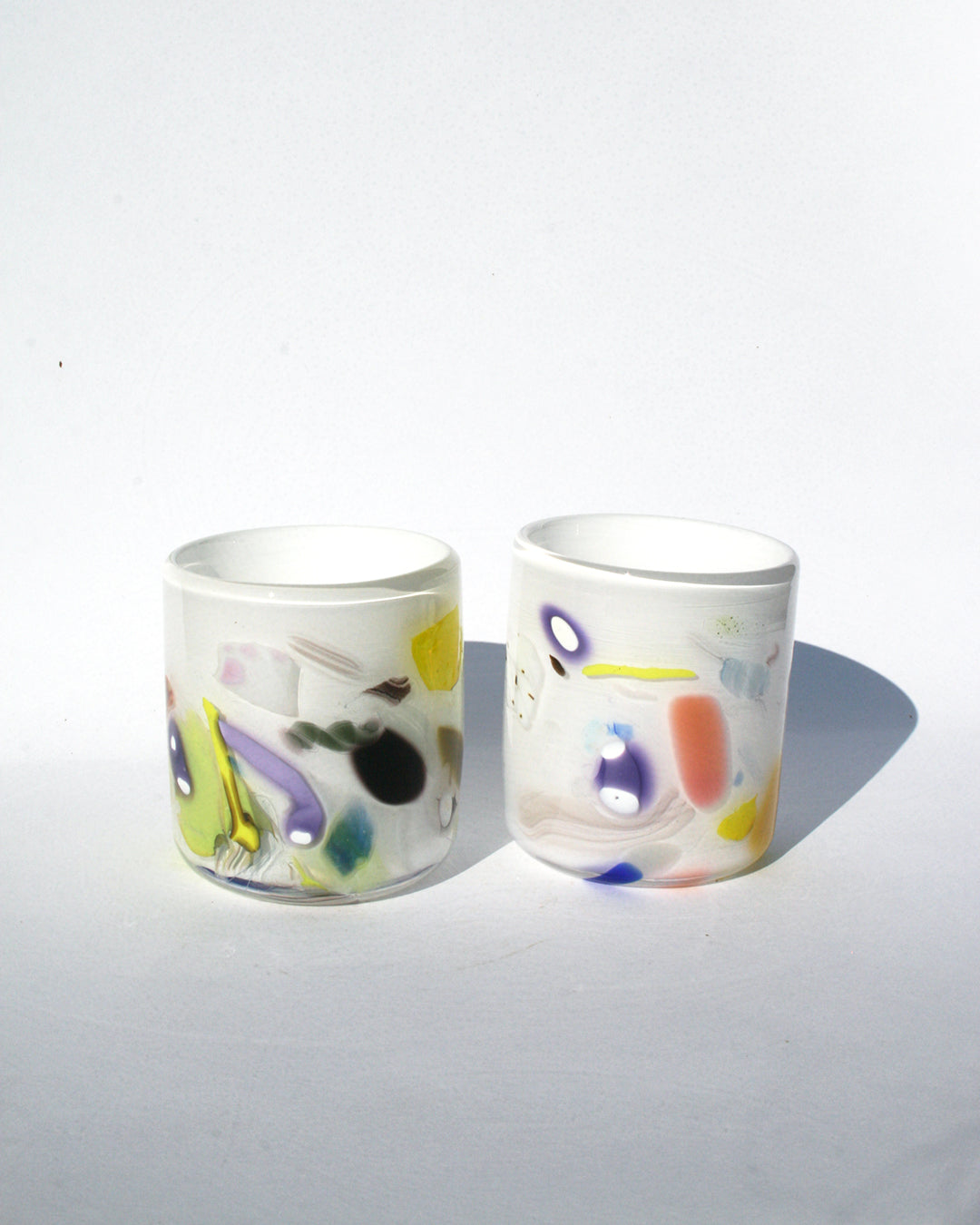 Tumblers are hand-blown and so natural variation occurs in size and decoration. The tumblers may not be exactly as they appear in the photo but they will be a close approximation.